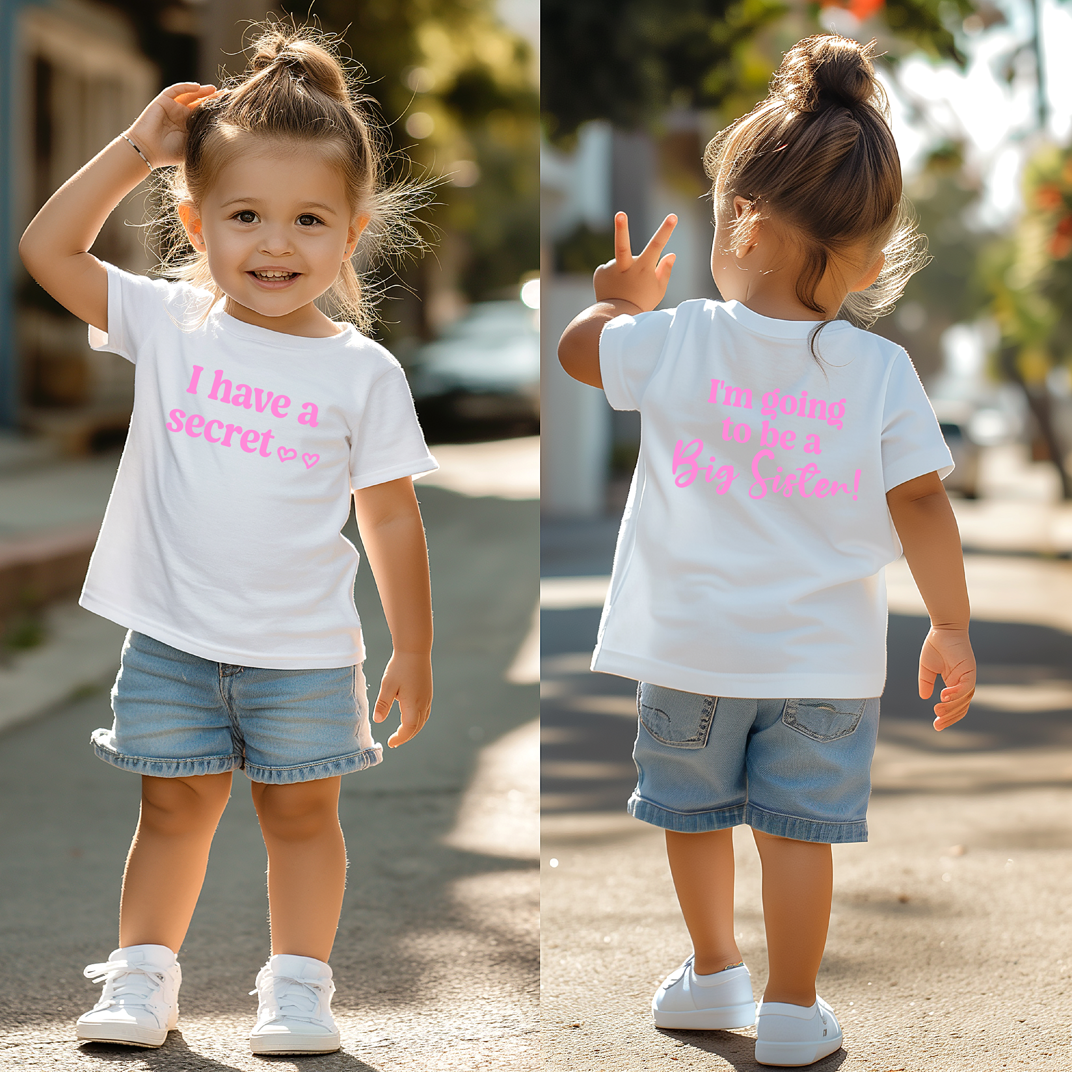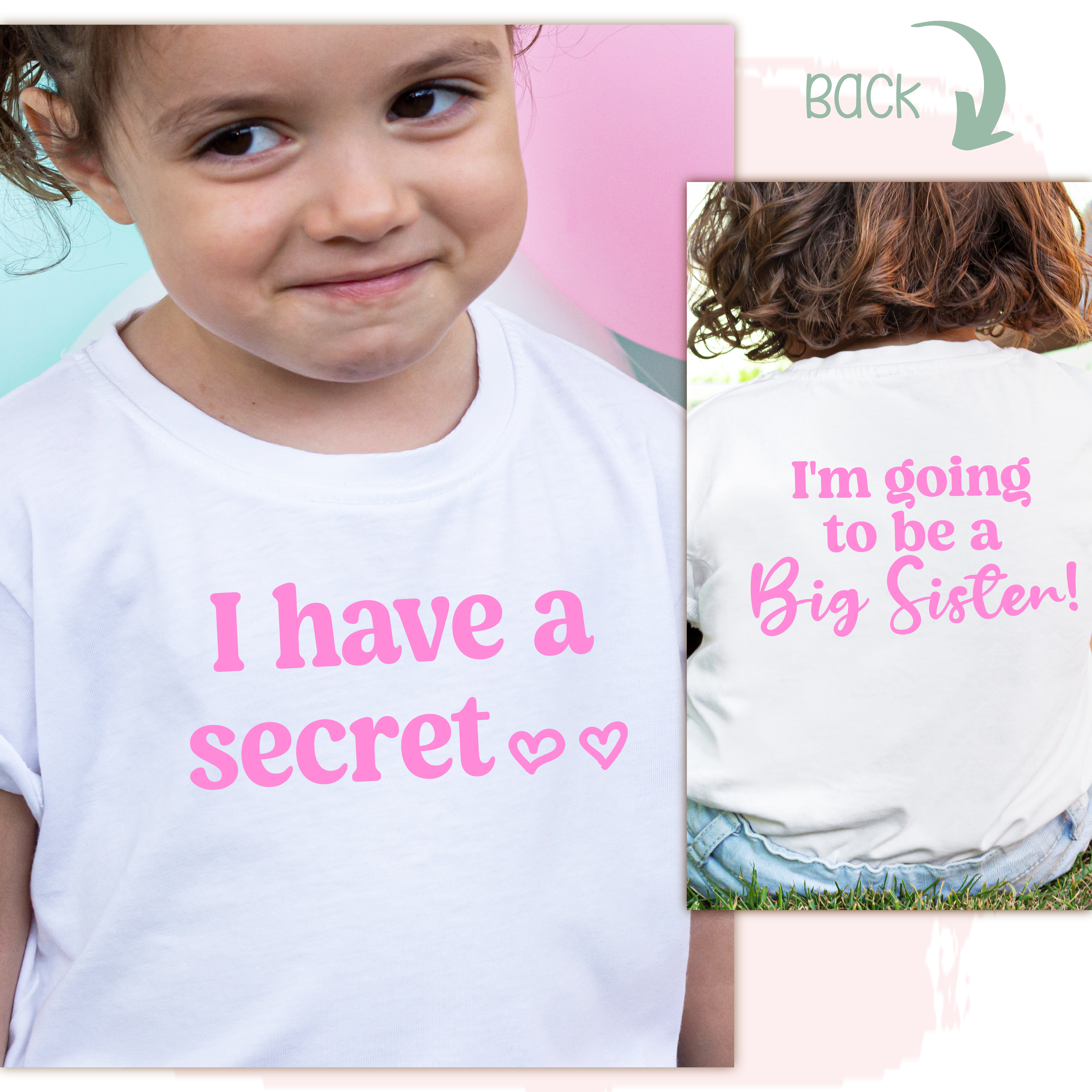 Get ready to make the sweetest big sister announcement with this adorable SVG bundle! This bundle includes two SVG designs, one for the front and back of a little girl's shirt, featuring the phrases "I have a secret" and "I'm going to be a Big Sister!" in fun and playful fonts. These designs are perfect for creating a unique and memorable way to announce your pregnancy to your family and friends. Simply use these SVGs to create your own custom t-shirts, onesies, or any other craft project you can think of! The possibilities are endless with this cute and versatile bundle. So why wait? Start crafting and let the excitement begin!